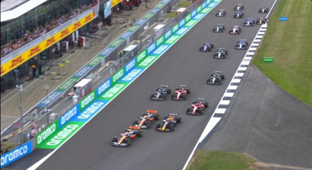 Signore e signori, sta per partire il GP di Gran Bretagna 2023! Allacciate le cinture e partiamo insieme in questo viaggio! In pole c’è Max Verstappen, affiancato da Lando Norris. Si accendono i semafori, poi si spengono, è partito il Gran Premio di Gran Bretagna! Scatto fulmineo delle due McLaren che per poco non superano entrambe Verstappen. Piastri deve accontentarsi del terzo posto, mentre Norris mette le ruote avanti a quelle dell’olandese. Nel frattempo Russell scavalca Sainz in quinta posizione. La leadership dell’inglese “arancione” dura solo cinque giri. Il sorpasso di Verstappen è il preludio a un probabilissimo, ennesimo, GP senza storia. A seguire il campione del mondo in carica e le due McLaren, ci sono i terzetti Leclerc-Russell-Sainz e Alonso-Hamilton-Gasly. Al giro 7 Hamilton completa il sorpasso su Alonso. Poche tornate più tardi, Esteban Ocon accusa problemi alla sua monoposto ed è costretto al ritiro, fermandosi ai box.