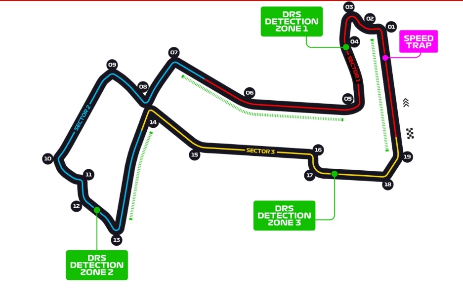 Al lungo rettilineo della partenza segue una serie di 4 curve gudate dalle quali si esce ad elevate velocità sino ad arrivare alla curva 5 e ad un nuovo rettilineo inframezzato dalla veloce curva 6 e termina con il memorial corner al quale segue la curva del ponte e la Padang.