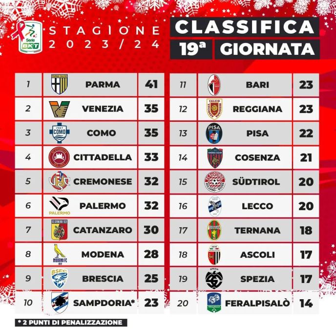 Il Brescia, con la prima sconfitta dopo 7 risultati utili consecutivi, vede allontanarsi leggermente la zona playoff, mentre il Parma termina l’anno da capolista in solitaria con un vantaggio di +6 sulle inseguitrici.