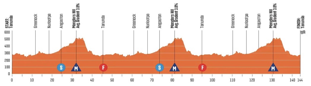1º TAPPA, TANUNDA – TANUNDA: La cavalcata verso Mount Lofty inizierà su questo percorso di 140 chilometri, con 2 sprint intermedi e 3 GPM di quarta categoria. Si potrebbero visionare due scenari: un’arrivo in volata con i velocisti protagonisti, oppure una leggera selezione sull’ultimo passaggio del Menglers Hill, che potrebbe precludere la vittoria ad alcuni atleti meno resistenti.