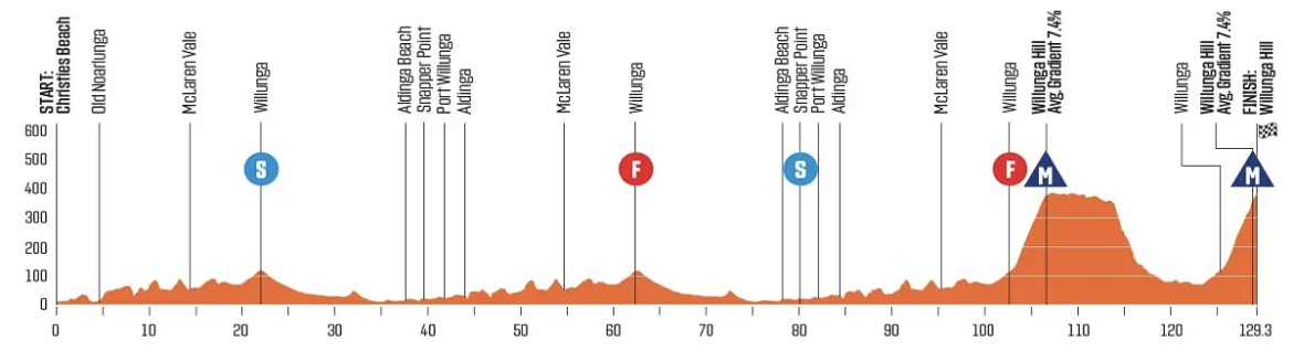 5° TAPPA, CHRISTIES – WILLUNGA HILL: Nella quinta frazione si raggiunge il primo arrivo in salita sul Willunga Hill, presente dalla edizione 2020. Il percorso di 129.3 chilometri incorpora due sprint intermedi e due GPM. Il dislivello complessivo è di 1413 metri, con la salita finale decisiva lunga 3 km al 7.5% e una pendenza massima del 22.7%.