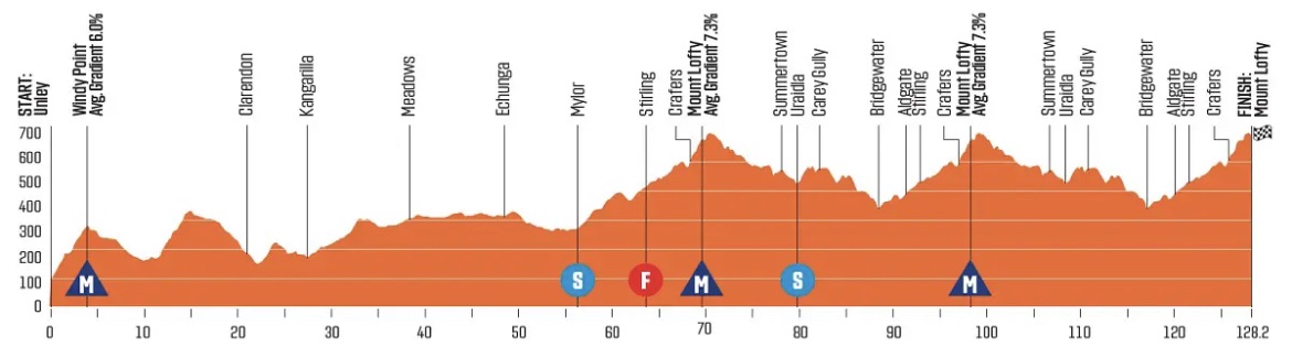 6° TAPPA, UNLEY – MOUNT LOFTY: Anche nell’ultimo appuntamento sono presenti salite impegnative. 2375 metri di dislivello distribuiti in 128.2 chilometri con tre GPM e due sprint intermedi. La retta conclusiva di Mount Lofty è lunga poco più di sei chilometri al 3,3%, con gli ultimi 1,3 chilometri che presentano una pendenza media del 7,3%.